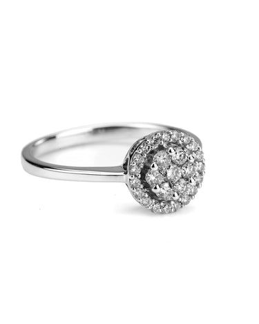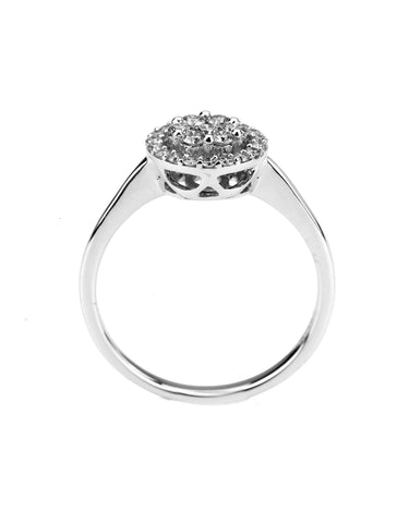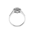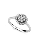 Anello completamente realizzato a mano, gioiello caratterizzato da sette diamanti taglio brillante più grandi circondati da altri diamanti di caratura più piccola. Accessorio che eleva lo stile di chi lo indossa.