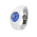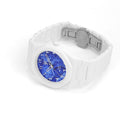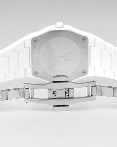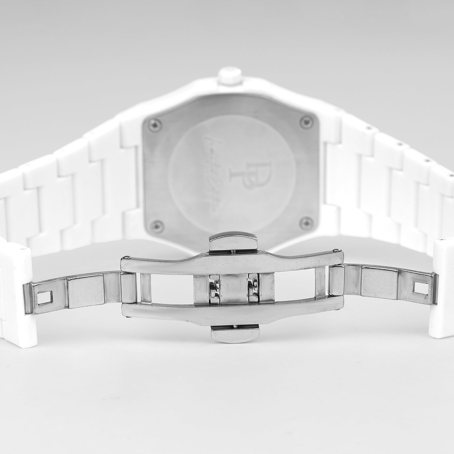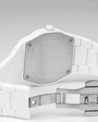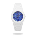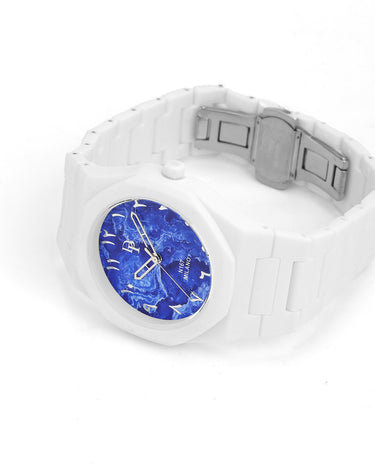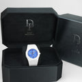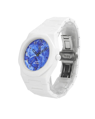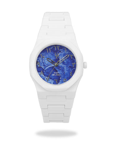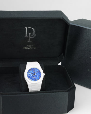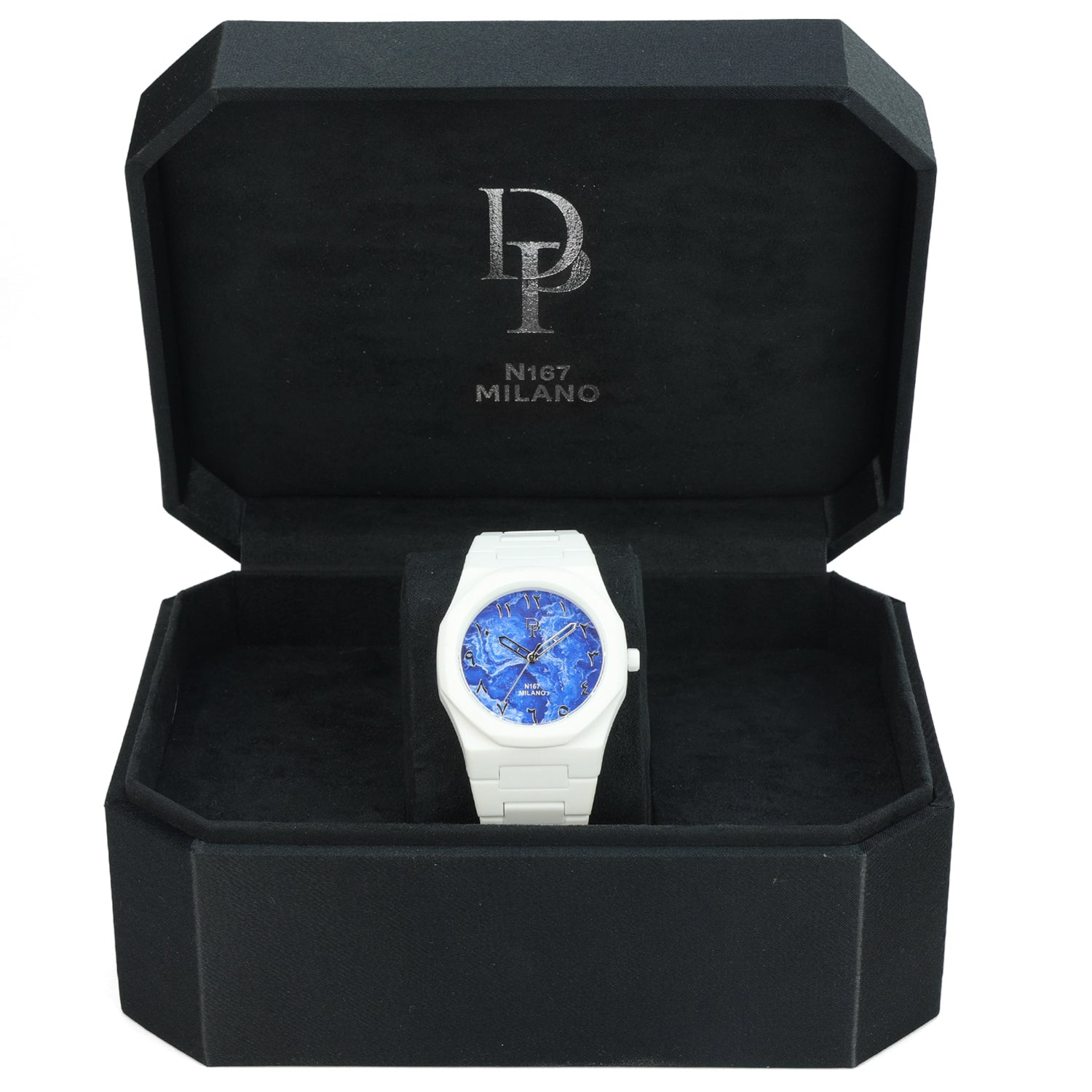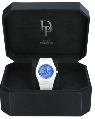 Un omaggio all'eleganza e alla fluidità del mare. Il DP Watch Polycarbon #2 presenta una cassa 40,5 mm in policarbonato soft-touch, che offre leggerezza e una piacevole sensazione al tatto. Il quadrante marmorizzato blu sfumato in celeste evoca la profondità e il movimento delle onde, creando un effetto visivo unico e suggestivo. I dettagli in argento- dagli indici con numeri arabi alla lancette, fino alla chiusura del cinturino - aggiungono un tocco di modernità e brillantezza.